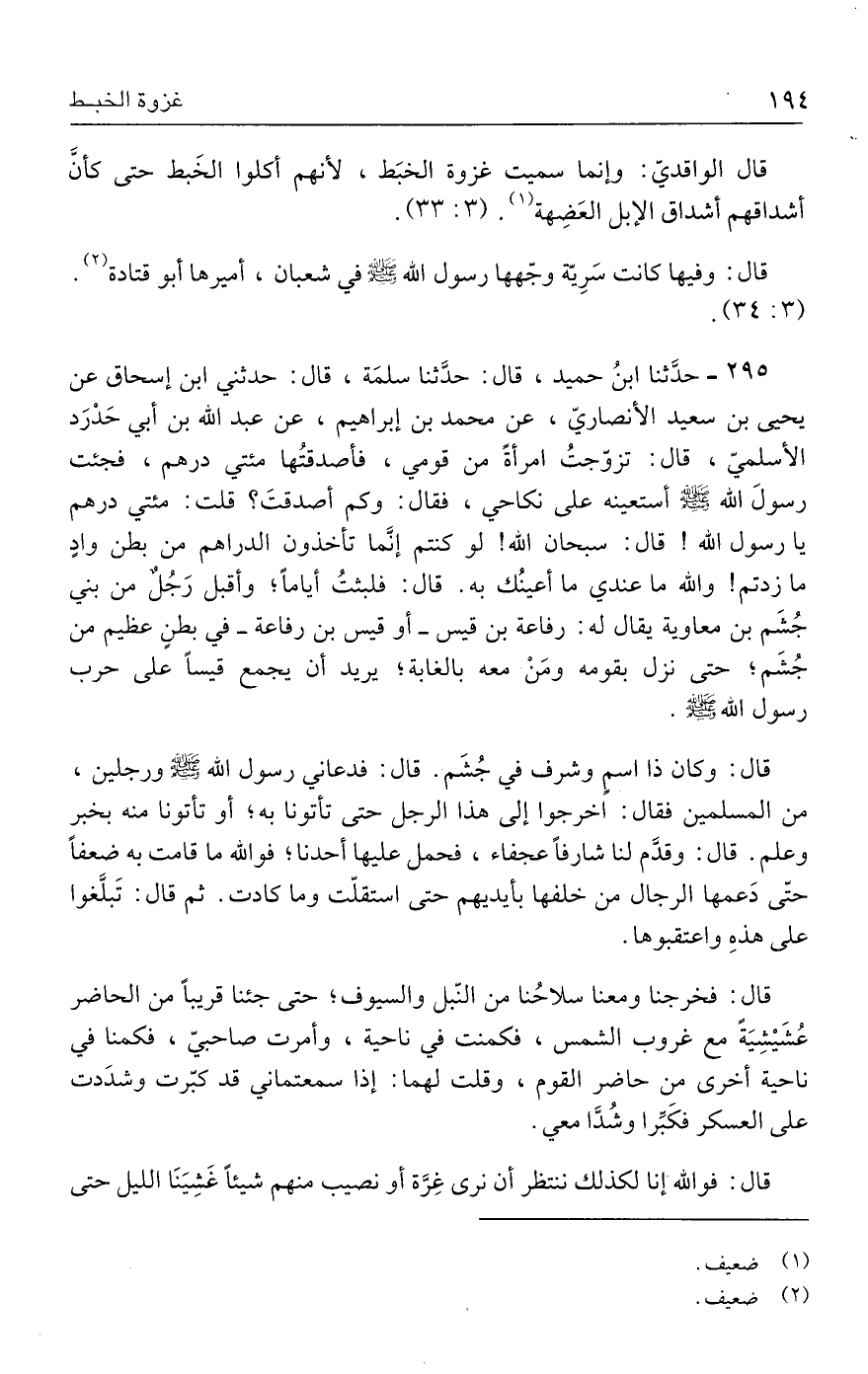 ٢٩٥ - حدَّثنا ابنُ حميد، قال: حدَّثنا سلمَة، قال: حدثني ابن إسحاق عن يحيى بن سعيد الأنصاريّ، عن محمد بن إبراهيم، عن عبد الله بن أبي حَدْرَد الأسلميّ، قال: تزوّجتُ امرأةً من قومي، فأصدقتُها مئتي درهم، فجئت رسولَ الله - صلى الله عليه وسلم - أستعينه على نكاحي، فقال: وكم أصدقتَ؟ قلت: مئتي درهم يا رسول الله! قال: سبحان الله! لو كنتم إنَّما تأخذون الدراهم من بطن وادٍ ما زدتم! والله ما عندي ما أعينُك به. قال: فلبثتُ أيامًا؛ وأقبل رَجُلٌ من بني جُشَم بن معاوية يقال له: رفاعة بن قيس -أو قيس بن رفاعة- في بطنٍ عظيم من جُشَم؛ حتى نزل بقومه ومَنْ معه بالغابة؛ يريد أن يجمع قيسًا على حرب رسول الله - صلى الله عليه وسلم -.