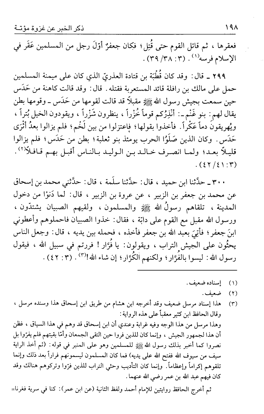 ٣٠٠ - حدَّثنا ابن حميد، قال: حدَّثنا سلَمة، قال: حدَّثني محمد بن إسحاق عن محمد بن جعفر بن الزبير، عن عروة بن الزبير، قال: لما دَنوْا من دخول المدينة، تلقاهم رسولُ الله - صلى الله عليه وسلم - والمسلمون، ولقيهم الصبيان يشتدّون، ورسول الله مقبل مع القوم على دابّه، فقال: خذوا الصبيان فاحملوهم وأعطوني ابنَ جعفر؛ فأتِيَ بعبد الله بن جعفر فأخذه، فحمله بين يديه، قال: وجعل الناس يحثُون على الجيش التراب، ويقولون: يا فُرَّار! فررتم في سبيل الله، فيقول رسول الله: ليسوا بالفُرَّار؛ ولكنهم الكُرَّار؛ إن شاء الله! (٣). (٣: ٤٢).