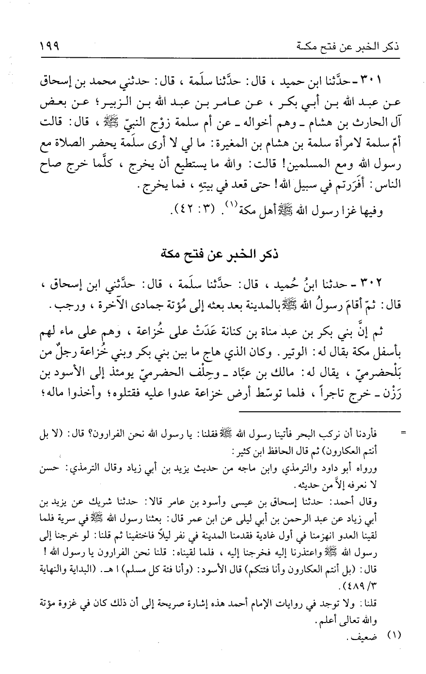 ٣٠٢ - حدثنا ابنُ حُميد، قال: حدَّثنا سلَمة، قال: حدَّثني ابن إسحاق، قال: ثمّ أقامَ رسولُ الله - صلى الله عليه وسلم - بالمدينة بعد بعثه إلى مُؤتة جمادى الآخرة، ورجب.