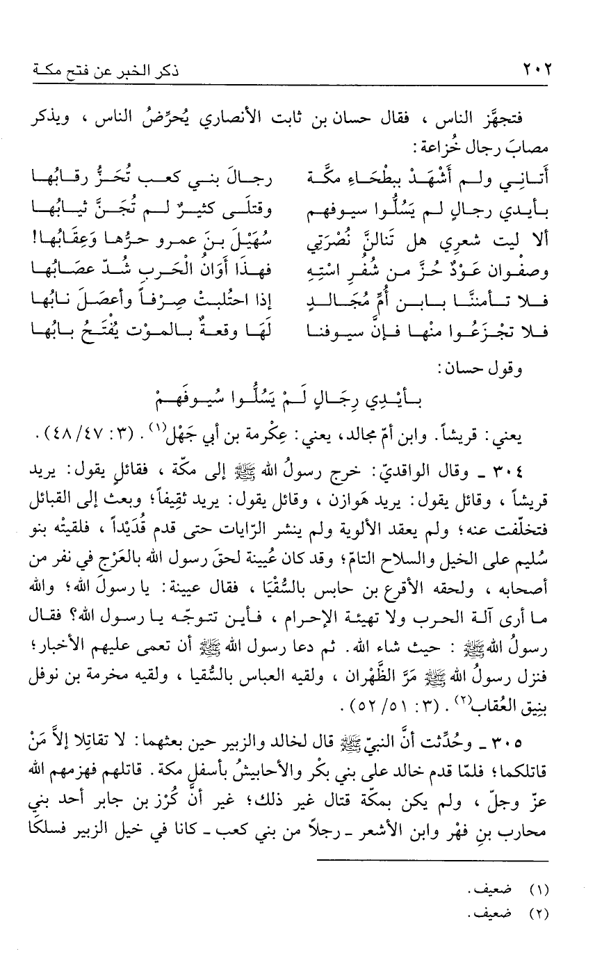 ٣٠٥ - وحُدِّثت أن النبيّ - صلى الله عليه وسلم - قال لخالد والزبير حين بعثهما: لا تقاتِلا إلَّا مَنْ قاتلكما؛ فلمّا قدم خالد علي بني بكْر والأحابيشُ بأسفل مكة. قاتلهم فهزمهم الله عزّ وجلّ، ولم يكن بمكّة قتال غير ذلك؛ غير أن كُرْز بن جابر أحد بني محارب بن فهْر وابن الأشعر -رجلًا من بني كعب- كانا في خيل الزبير فسلكَا