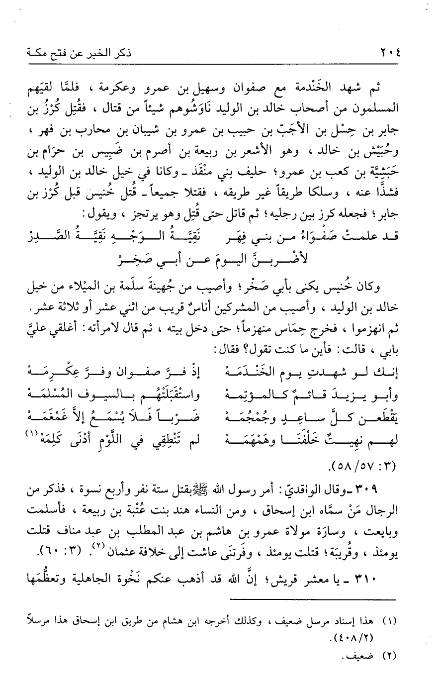 ٣٠٩ - وقال الواقديّ: أمر رسول الله - صلى الله عليه وسلم - بقتل ستة نفر وأربع نسوة، فذكر من الرجال مَنْ سمَّاه ابن إسحاق، ومن النساء هند بنت عُتْبة بن ربيعة، فأسلمت وبايعت، وسارَة مولاة عمرو بن هاشم بن عبد المطلب بن عبد مناف قتلت يومئذ، وقُريبَة؛ قتلت يومئذ، وفرتنَى عاشت إلى خلافة عثمان (٢). (٣: ٦٠).