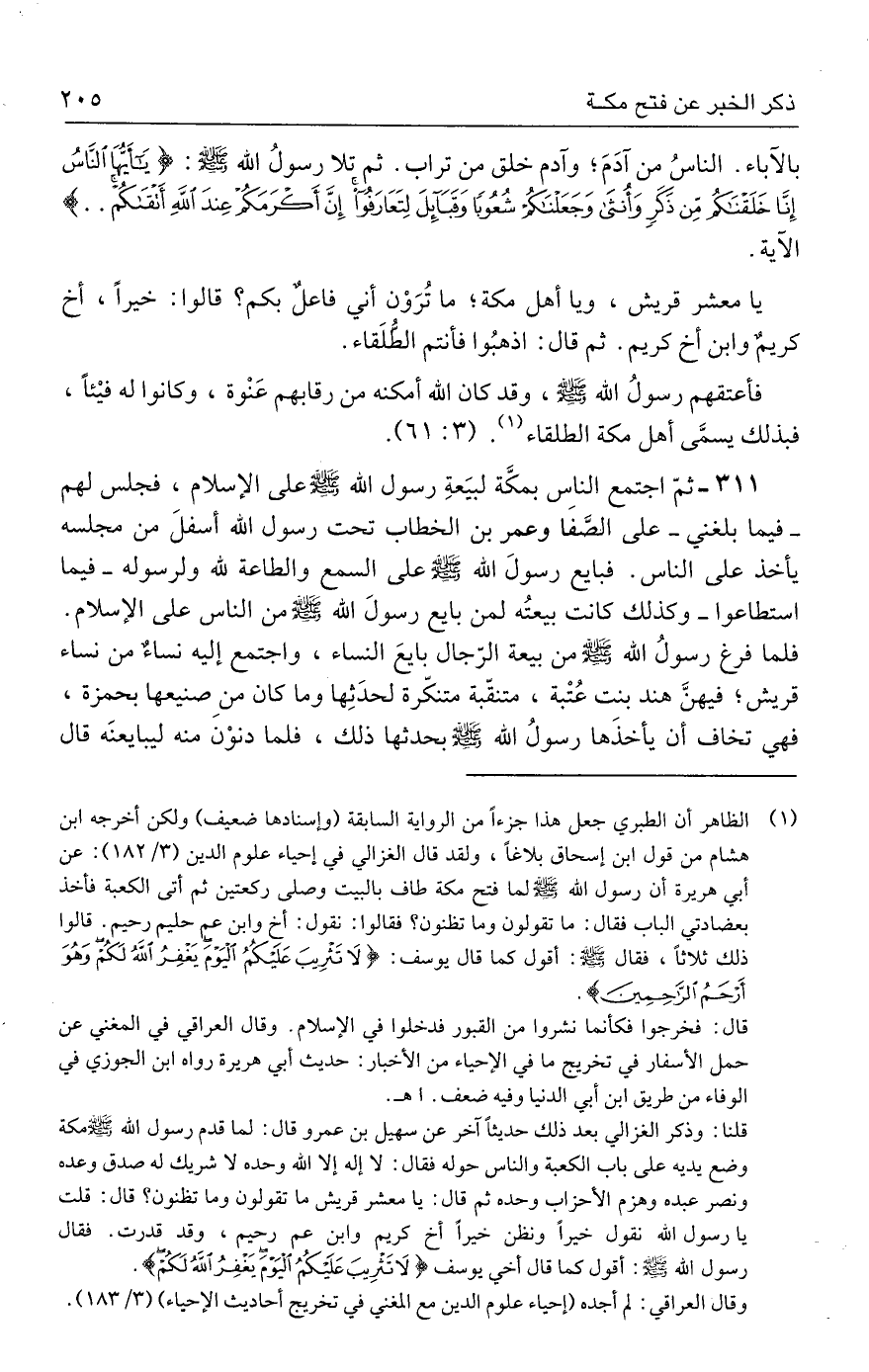 فأعتقهم رسولُ الله - صلى الله عليه وسلم -، وقد كان الله أمكنه من رقابهم عَنْوة، وكانوا له فيئًا، فبذلك يسمَّى أهل مكة الطلقاء (١). (٣: ٦١).