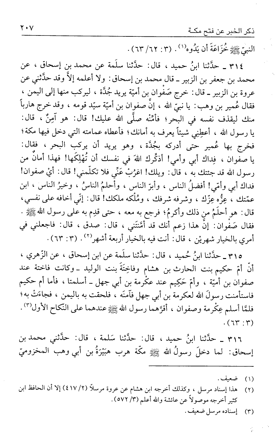 ٣١٥ - حدَّثنا ابنُ حُميد، قال: حدَّثنا سلَمة عن ابن إسحاق، عن الزّهري، أنّ أمّ حكيم بنت الحارث بن هشام وفاخِتَةَ بنت الوليد -وكانت فاختة عند صفوان بن أميّة، وأمّ حَكِيم عند عكْرمة بن أبي جهل- أسلمتا، فأما أم حكيم فاستأمنت رسولَ الله لعكرمة بن أبي جهل فآمنَه، فلحقت به باليمن، فجاءَتْ به؛ فلمَّا أسلم عِكْرمة وصفوان، أقرَّهما رسول الله - صلى الله عليه وسلم - عندهما على النّكاح الأول (٣). (٣: ٦٣).