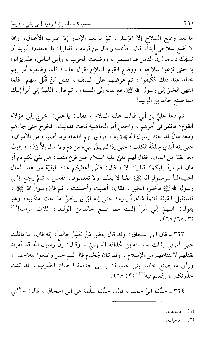 ٣٢٣ - قال ابن إسحاق: وقد قال بعض مَنْ يَعْذِرُ خالدًا: إنه قال: ما قاتلت حتى أمرني بذلك عبد الله بن حُذافة السهميّ، وقال: إنَّ رسولَ الله قد أمرك بقتلهم لامتناعهم من الإسلام، وقد كان جَحْدم قال لهم حين وضعوا سلاحهم، ورأى ما يصنع خالد ببني جذيمة: يا بني جذيمة! ضاع الضّرب، قد كنت حذّرتكم ما وقعتم فيه (٢)! (٣: ٦٨).