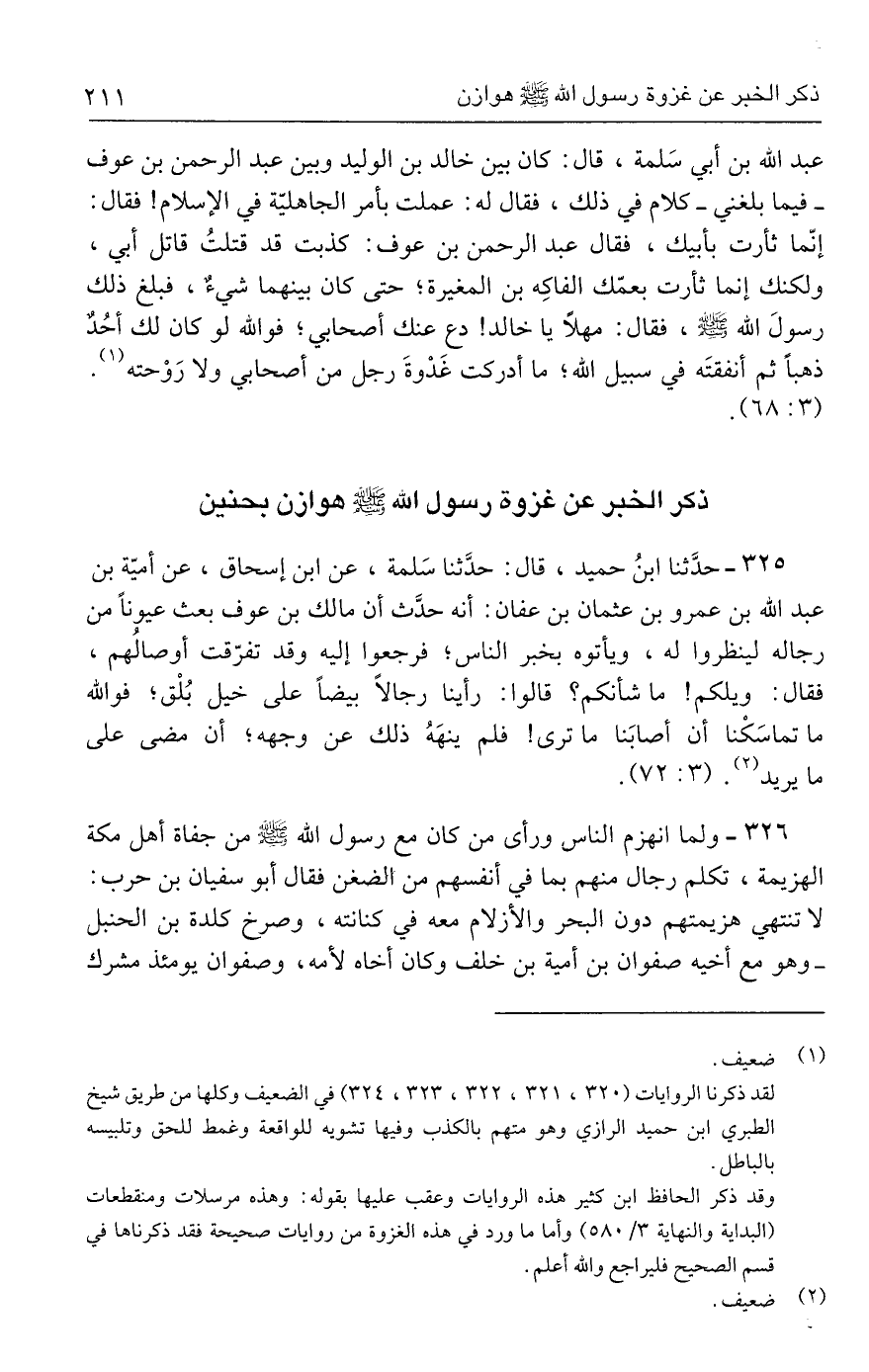 لقد ذكرنا الروايات (٣٢٠، ٣٢١، ٣٢٢، ٣٢٣، ٣٢٤) في الضعيف وكلها من طريق شيخ الطبري ابن حميد الرازي وهو متهم بالكذب وفيها تشويه للواقعة وغمط للحق وتلبيسه بالباطل.