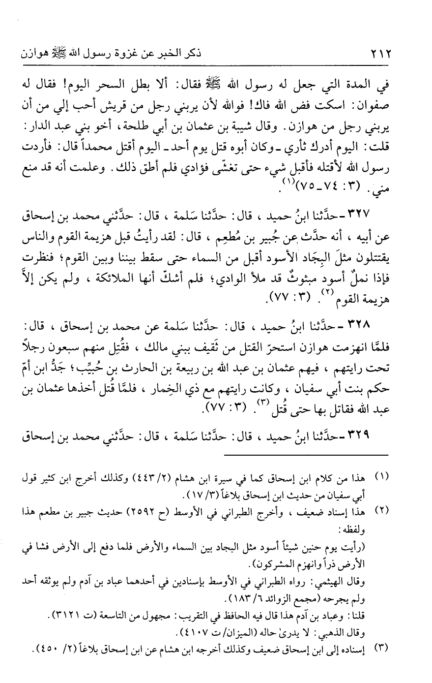 ٣٢٨ - حدَّثنا ابنُ حميد، قال: حدَّثنا سَلمة عن محمد بن إسحاق، قال: فلمَّا انهزمت هوازن استحرّ القتل من ثَقيف ببني مالك، فقُتِل منهم سبعون رجلًا تحت رايتهم، فيهم عثمان بن عبد الله بن ربيعة بن الحارث بن حُبيِّب؛ جَدُّ ابن أمّ حكم بنت أبي سفيان، وكانت رايتهم مع ذي الخِمار، فلمَّا قُتل أخذها عثمان بن عبد الله فقاتل بها حتى قُتل (٣). (٣: ٧٧).