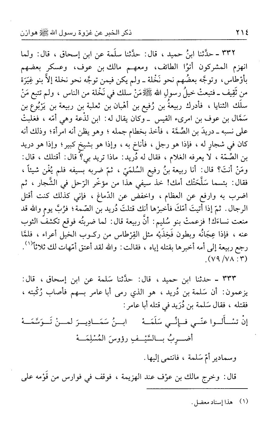 ٣٣٢ - حدَّثنا ابنُ حميد، قال: حدَّثنا سلَمة عن ابن إسحاق، قال: ولما انهزم المشركون أتوُا الطائف، ومعهم مالك بن عوف، وعسكر بعضهم بأوْطاس، وتوجَّه بعضُهم نحو نَخْلة -ولم يكن فيمن توجَّه نحو نخلة إلَّا بنو غِيَرَة من ثَقِيف- فتبعتْ خيلُ رسولِ الله - صلى الله عليه وسلم - مَنْ سلك في نَخْلة من الناس، ولم تتبع مَنْ سلَك الثنايا، فأدرك ربيعةُ بن رُفيع بن أهْبان بن ثعلبة بن ربيعة بن يَرْبُوع بن سَمَّال بن عوف بن امرئ القيس -كان يقال له: ابن لذْعة وهي أمّه، فغلبتْ على نسبه- دريدَ بن الصِّمَّة، فأخذ بخطام جمله؛ وهو يظن أنه امرأة؛ وذلك أنه كان في شجارٍ له، فإذا هو رجل، فأناخ به، وإذا هو بشيخٍ كبير؛ وإذا هو دريد بن الصِّمّة، لا يعرفه الغلام، فقال له دُريد: ماذا تريد بي؟ قال: أقتلك، قال: ومَنْ أنتَ؟ قال: أنا ربيعة بن رفيع السُلمَيّ، ثمّ ضربه بسيفه فلم يُغْن شيئًا، فقال: بئسما سَلَّحَتْك أمك! خذ سيفي هذا من مؤخّر الرّحل في الشَّجار، ثم اضرب به وارفع عن العظام، واخفض عن الدّماغ، فإني كذلك كنت أقتل الرجال. ثمّ إذا أتيتَ أمّكَ فأخبرْها أنك قتلتَ دُريد بن الصّمة؛ فرُبَّ يومٍ والله قد منعت نساءَك! فزعمتْ بنو سُليم: أن ربيعة قال: لما ضربتُه فوقع تكشف الثوب عنه، فإذا عِجَانُه وبطون فَخِذَيه مثل القِرْطاس من ركوب الخيل أعراء، فلمَّا رجع ربيعة إلى أمه أخبرها بقتله إياه، فقالت: والله لقد أعتق أمّهات لك ثلاثًا (١). (٣: ٧٨/ ٧٩).