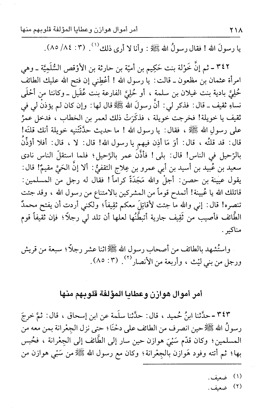 ٣٤٣ - حدَّثنا ابنُ حُميد، قال: حدَّثنا سلَمة عن ابن إسحاق، قال: ثمَّ خرجَ رسول الله - صلى الله عليه وسلم - حين انصرف من الطائف على دحْنَا؛ حتى نزل الجِعْرانة، بمن معه من المسلمين؛ وكان قدّم سَبْيَ هوازن حين سار إلى الطَّائف إلى الجِعْرانة، فحُبس بها؛ ثم أتته وفود هَوازن بالجِعْرانة؛ وكان مع رسول الله - صلى الله عليه وسلم - من سَبْي هوازن من