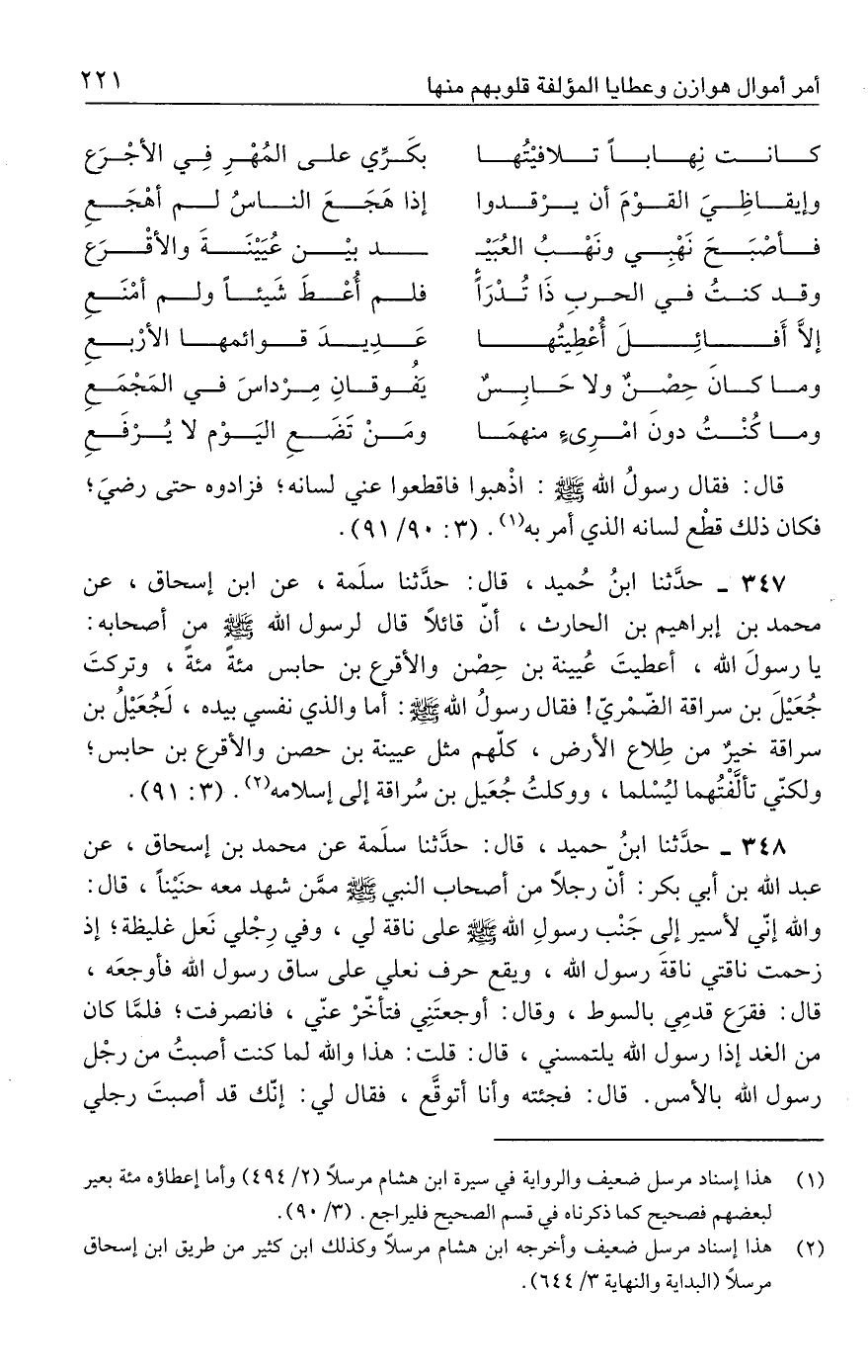 (١) هذا إسناد مرسل ضعيف والرواية في سيرة ابن هشام مرسلًا (٢/ ٤٩٤) وأما إعطاؤه مئة بعير لبعضهم فصحيح كما ذكرناه في قسم الصحيح فليراجع. (٣/ ٩٠).
