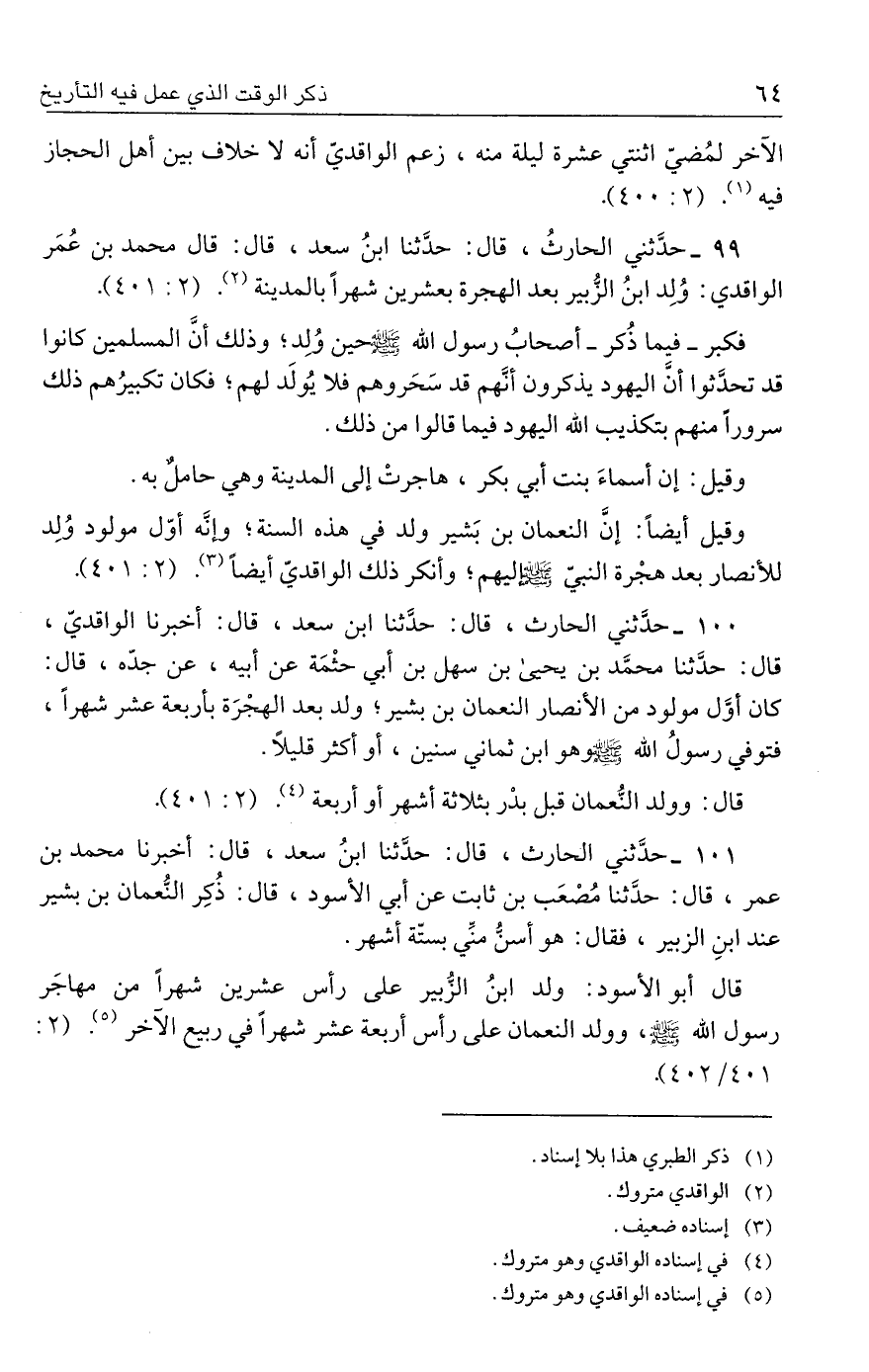 ٩٩ - حدَّثني الحارثُ، قال: حدَّثنا ابنُ سعد، قال: قال محمد بن عُمَر الواقدي: وُلِد ابنُ الزُّبير بعد الهجرة بعشرين شهرًا بالمدينة (٢). (٢: ٤٠١).