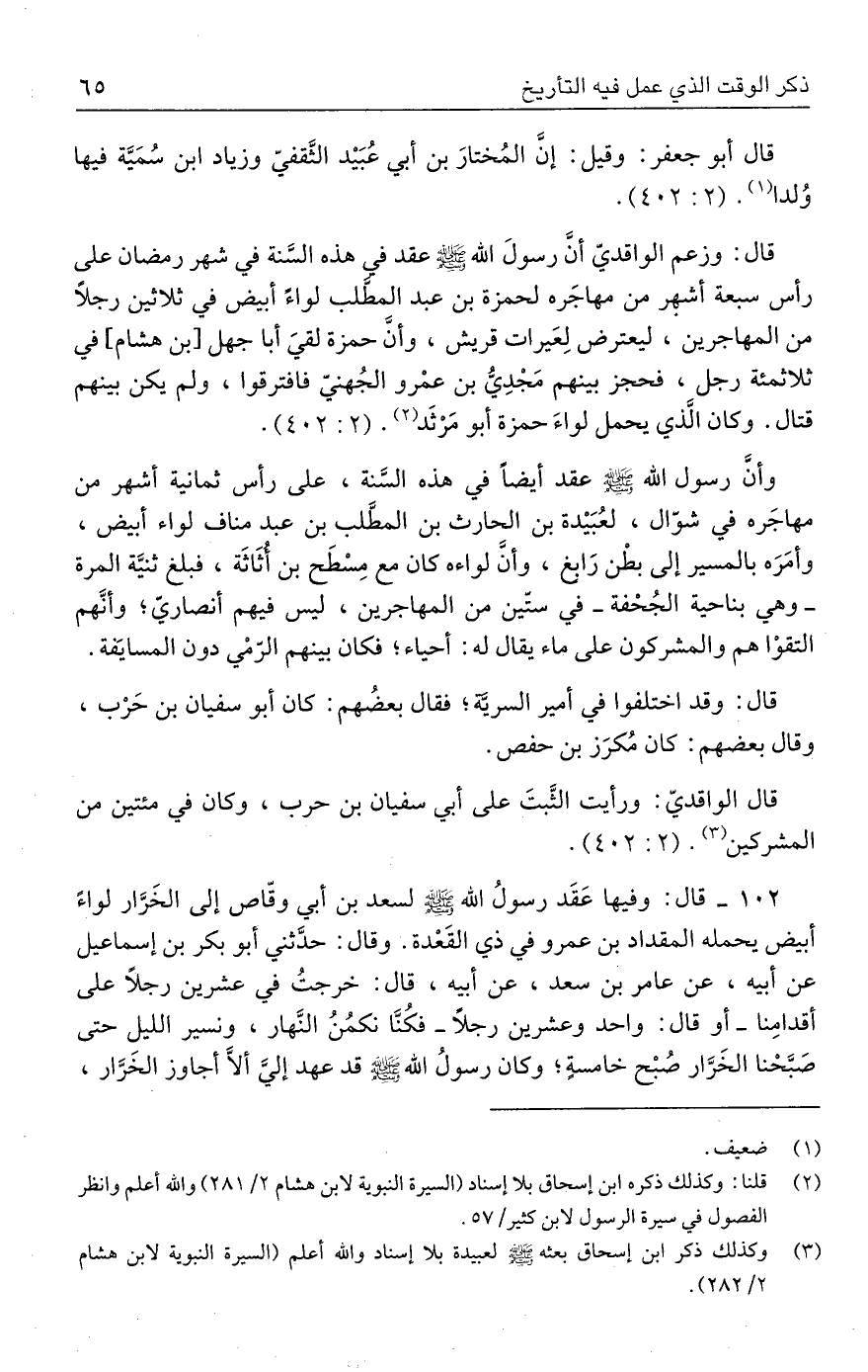 (٣) وكذلك ذكر ابن إسحاق بعثه - صلى الله عليه وسلم - لعبيدة بلا إسناد والله أعلم (السيرة النبوية لابن هشام ٢/ ٢٨٢).