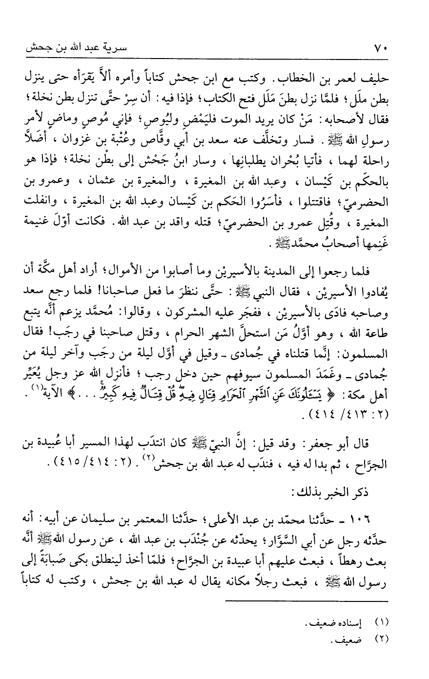 قال أبو جعفر: وقد قيل: إنَّ النبيَّ - صلى الله عليه وسلم - كان انتدَب لهذا المسير أبا عُبيدة بن الجرَّاح، ثم بدا له فيه، فندَب له عبد الله بن جحش (٢). (٢: ٤١٤/ ٤١٥).