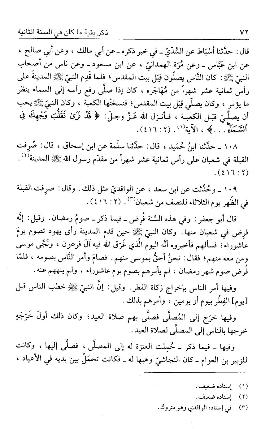 ١٠٨ - حدَّثنا ابنُ حُمَيد، قال: حدَّثنا سلَمة عن ابن إسحاق، قال: صُرِفت القبلة في شعبان على رأس ثمانية عشر شهرًا من مقدَم رسول الله - صلى الله عليه وسلم - المدينة (٢). (٤١٦: ٢).