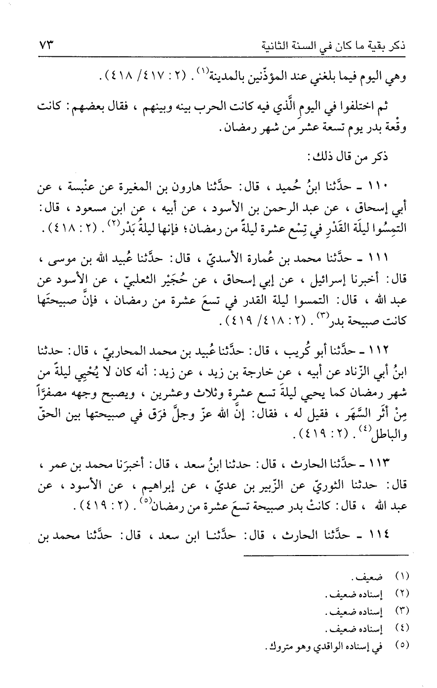 ١١١ - حدَّثنا محمد بن عُمارة الأسديّ، قال: حدَّثنا عُبيد الله بن موسى، قال: أخبرنا إسرائيل، عن أبي إسحاق، عن حُجَير الثعلبيّ، عن الأسود عن عبد الله، قال: التمسوا ليلة القدر في تسعَ عشرة من رمضان، فإنَّ صبيحتَها كانت صبيحة بدر (٣). (٢: ٤١٨/ ٤١٩).