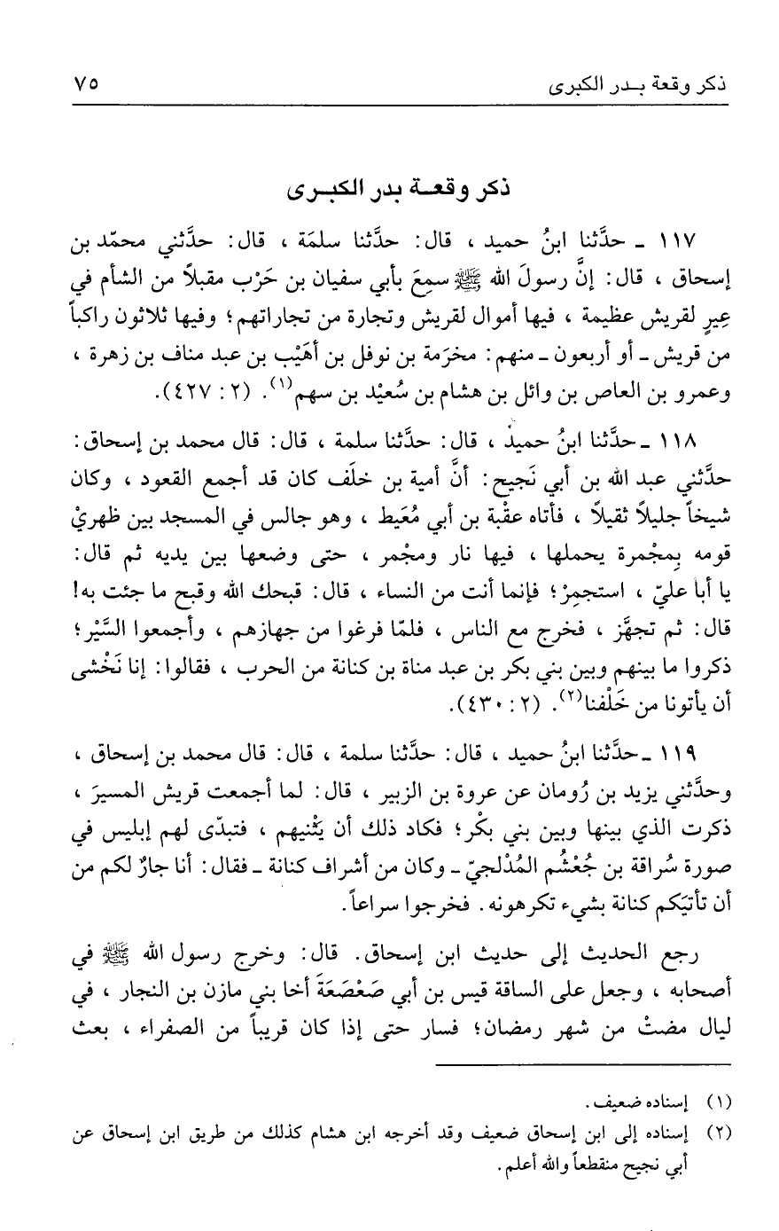 ١١٧ - حدَّثنا ابنُ حميد، قال: حدَّثنا سلمَة، قال: حدَّثني محمّد بن إسحاق، قال: إنَّ رسولَ الله - صلى الله عليه وسلم - سمِعَ بأبي سفيان بن حَرْب مقبلًا من الشام في عِيرٍ لقريش عظيمة، فيها أموال لقريش وتجارة من تجاراتهم؛ وفيها ثلاثون راكبًا من قريش -أو أربعون- منهم: مخرَمة بن نوفل بن أهَيب بن عبد مناف بن زهرة، وعمرو بن العاص بن وائل بن هشام بن سُعيد بن سهم (١). (٢: ٤٢٧).