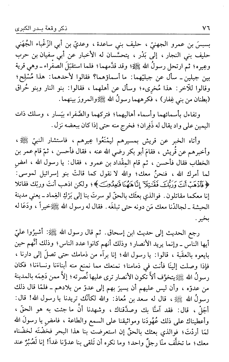 رجع الحديث إلى حديث ابن إسحاق. ثم قال رسول الله - صلى الله عليه وسلم -: أشيرُوا عليّ أيها الناس -وإنما يريد الأنصار؛ وذلك أنهم كانوا عدد الناس؛ وذلك أنَّهم حين بايعوه بالعقَبة، قالوا: يا رسول الله؛ إنا برآء من ذمامك حتى تصلَ إلى دارنا، فإذا وصلت إلينَا فأنت في ذمامنا؛ نمنعك مما نمنع منه أبناءَنا ونساءَنا؛ فكان رسولُ الله - صلى الله عليه وسلم - يتخوَّف ألَّا تكون الأنصار ترى عليها نُصرته، إلَّا ممن دَهِمَه بالمدينة من عدوّه، وأن ليس عليهم أن يسيرَ بهم إلى عدوّ من بلادهم - فلمّا قال ذلك رسولُ الله - صلى الله عليه وسلم -، قال له سعد بن مُعاذ: والله لكأنّك تريدنا يا رسول الله! قال: أجَلْ، قال: فقد آمنَّا بك وصدَّقناك، وشهدنا أن ما جئت به هو الحقّ، وأعطيناك على ذلك عُهُودَنا ومواثيقنا على السمع والطاعة، فامضِ يا رسولَ الله لمَا أردْتَ؛ فوالذي بعثك بالحقِّ إن استعرضت بنا هذا البحر فخضْتَه لخضْناه معك؛ ما تخلَّف منّا رجلٌ واحد؛ وما نكره أن تَلقى بنا عدوَّنا غدًا! إنا لَصُبُرٌ عند