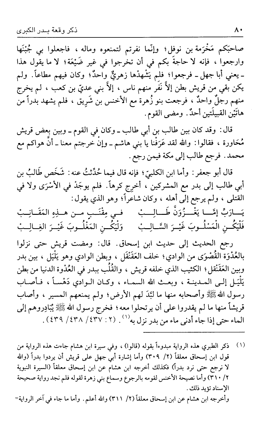 (١) ذكر الطبري هذه الرواية مبدوءًا بقوله (قالوا)، وفي سيرة ابن هشام جاءت هذه الرواية من قول ابن إسحاق معلقًا (٢/ ٣٠٩) وأما إشارة أبي جهل على قريش أن يردوا بدرًا (والله لا نرجع حتى نرد بدرًا) فكذلك أخرجه ابن هشام عن ابن إسحاق معلقًا (السيرة النبوية ٢/ ٣١٠) وأما نصيحة الأخنس لقومه بالرجوع وسماع بني زهرة لقوله فلم نجد رواية صحيحة الإسناد تؤيد ذلك.