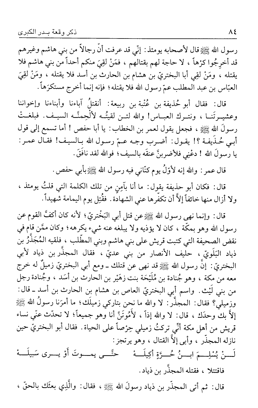 قال: وإنما نهى رسول الله - صلى الله عليه وسلم - عن قتل أبي البَخْتريّ، لأنه كان أكفَّ القوم عن رسول الله وهو بمكّة، كان لا يؤذيه ولا يبلغه عنه شيء يكرهه؛ وكان ممَّن قام في نقض الصحيفة التي كتبت قريش علي بني هاشم وبني المطّلب، فلقيه المُجَذَّرُ بن ذياد البَلَويّ، حليف الأنصار من بني عديّ، فقال المجذَّر بن ذياد لأبي البختريّ: إنَّ رسول الله - صلى الله عليه وسلم - قد نهى عن قتلك - ومع أبي البختريّ زميلٌ له خرج معه من مكة، وهو جُنادة بن مُلَيحَة بنت زهَير بن الحارث بن أسَد، وجُنادة رجل من بني لَيث. واسم أبي البختريّ العاص بن هشام بن الحارث بن أسد - قال: وزميلي؟ فقال: المجذَّر: لا والله ما نحن بتاركي زميلَك؛ ما أمرَنا رسولُ الله - صلى الله عليه وسلم - إلَّا بك وحدَك، قال: لا والله إذًا، لأَمُوتَنَّ أنا وهو جميعًا، لا تحدّث عنّي نساء قريش من أهل مكة أنِّي تركتُ زميلي حِرْصًا على الحياة. فقال أبو البختريّ حين نازله المجذَّر، وأبى إلّا القتال، وهو يرتجز: