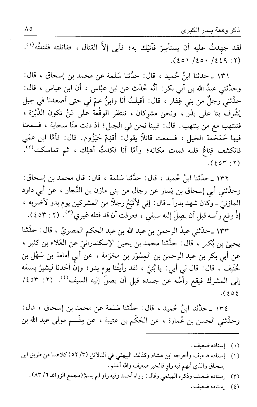 ١٣٢ - حدَّثنا ابنُ حُميد، قال: حدَّثنا سَلمة، قال: قال محمد بن إسحاق: وحدَّثني أبي إسحاق بن يَسار عن رجال من بني مازن بن النَّجار، عن أبي داود المازنيّ - وكان شهد بدرًا - قال: إني لأتْبَعُ رجلًا من المشركين يوم بدر لأضربه، إذْ وقع رأسه قبل أن يصِلَ إليه سيفي، فعرفت أن قد قتله غيري (٣). (٢: ٤٥٣).