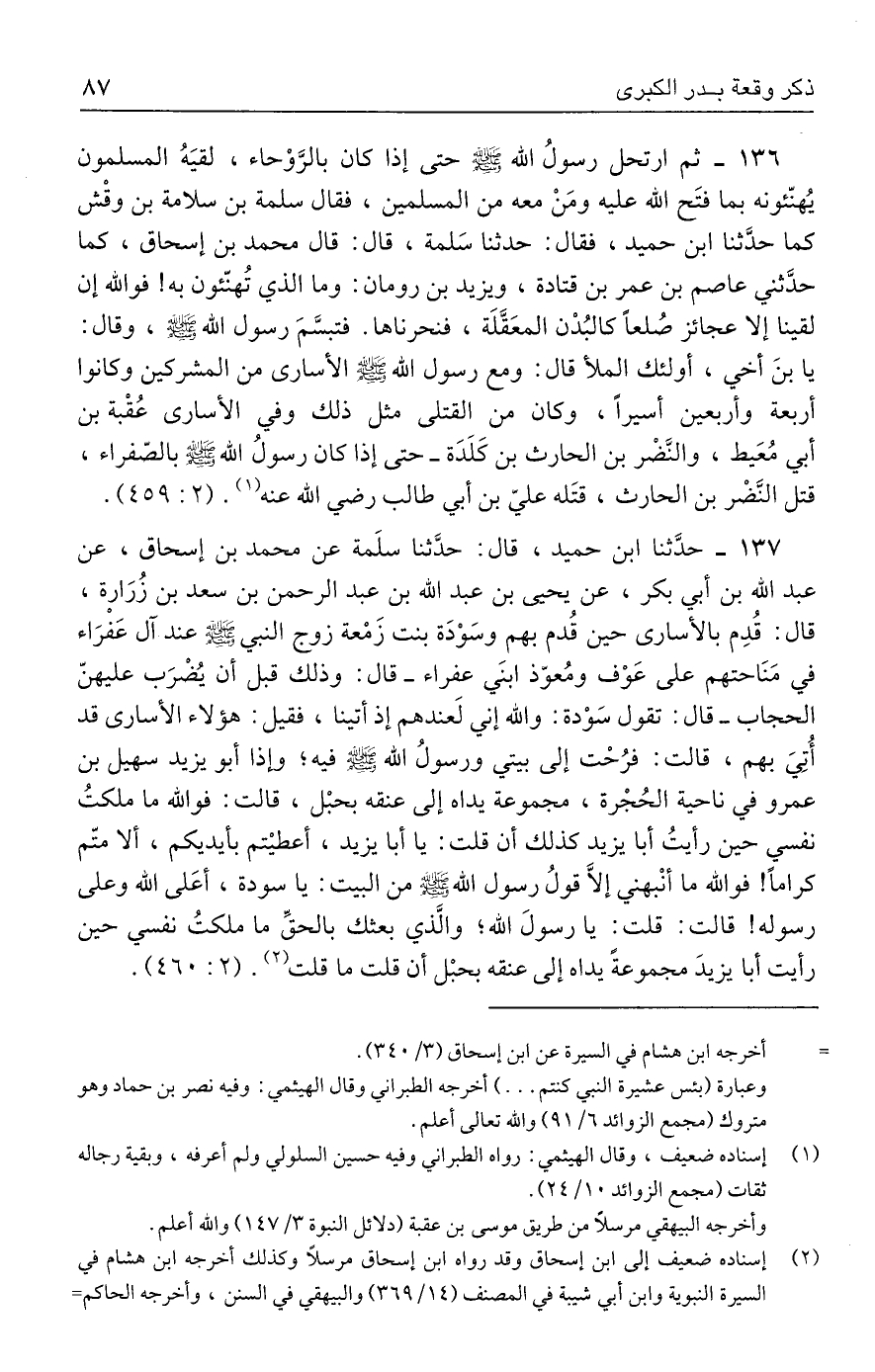 ١٣٧ - حدَّثنا ابن حميد، قال: حدَّثنا سلَمة عن محمد بن إسحاق، عن عبد الله بن أبي بكر، عن يحيى بن عبد الله بن عبد الرحمن بن سعد بن زُرَارة، قال: قُدِم بالأسارى حين قُدم بهم وسَوْدَة بنت زَمْعة زوج النبي - صلى الله عليه وسلم - عند آل عَفرَاء في مَنَاحتهم على عَوْف ومُعوّذ ابنَي عفراء - قال: وذلك قبل أن يُضرَب عليهنّ الحجاب - قال: تقول سَوْدة: والله إني لَعندهم إذ أتينا، فقيل: هؤلاء الأسارى قد أُتِيَ بهم، قالت: فرُحْت إلى بيتي ورسولُ الله - صلى الله عليه وسلم - فيه؛ وإذا أبو يزيد سهيل بن عمرو في ناحية الحُجْرة، مجموعة يداه إلى عنقه بحبْل، قالت: فوالله ما ملكتُ نفسي حين رأيتُ أبا يزيد كذلك أن قلت: يا أبا يزيد، أعطيتم بأيديكم، ألا متّم كرامًا! فوالله ما أنْبهني إلَّا قول رسول الله - صلى الله عليه وسلم - من البيت: يا سودة، أعَلى الله وعلى رسوله! قالت: قلت: يا رسول الله؛ والذي بعثك بالحقِّ ما ملكتُ نفسي حين رأيت أبا يزيدَ مجموعةً يداه إلى عنقه بحبْل أن قلت ما قلت (٢). (٢: ٤٦٠).