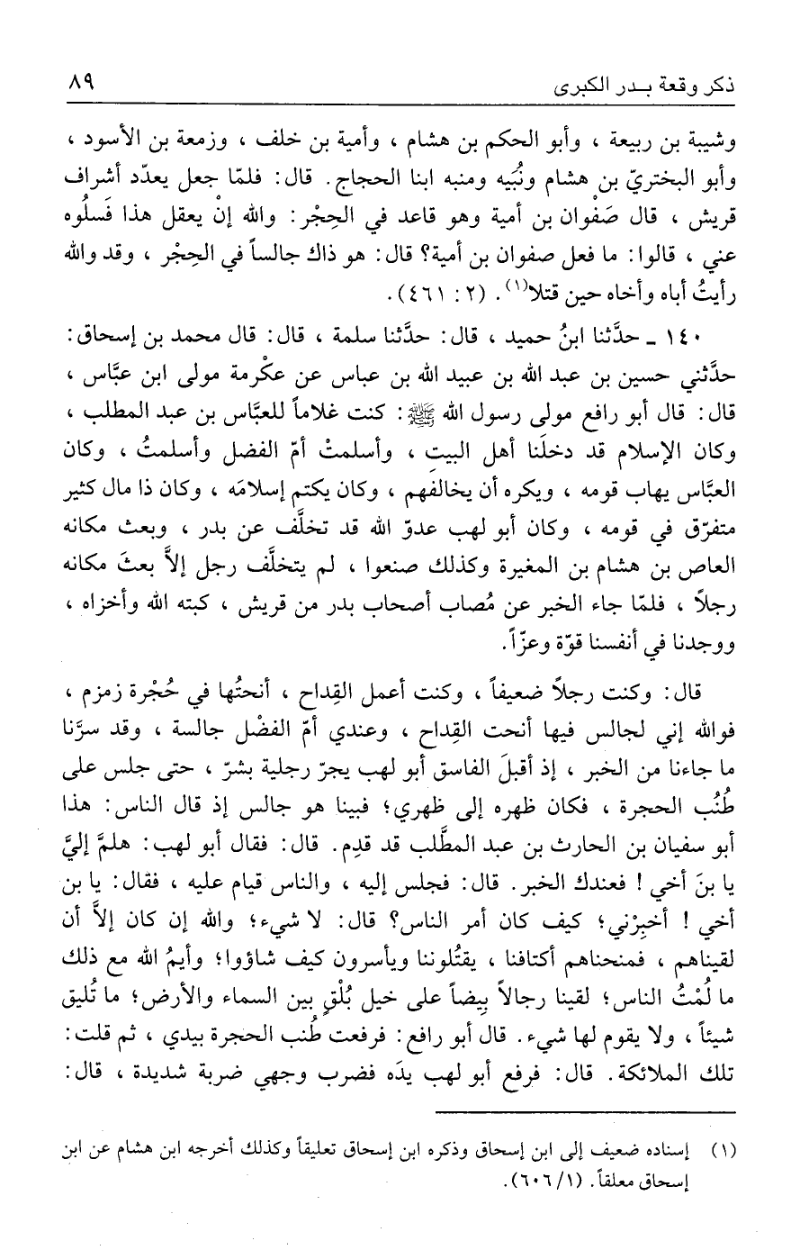 ١٤٠ - حدَّثنا ابنُ حميد، قال: حدَّثنا سلمة، قال: قال محمد بن إسحاق: حدَّثني حسين بن عبد الله بن عبيد الله بن عباس عن عكْرمة مولى ابن عبَّاس، قال: قال أبو رافع مولى رسول الله - صلى الله عليه وسلم -: كنت غلامًا للعبّاس بن عبد المطلب، وكان الإسلام قد دخلَنا أهل البيت، وأسلمتْ أمّ الفضل وأسلمتُ، وكان العبَّاس يهاب قومه، ويكره أن يخالفَهم، وكان يكتم إسلامَه، وكان ذا مال كثير متفرّق في قومه، وكان أبو لهب عدوّ الله قد تخلَّف عن بدر، وبعث مكانه العاص بن هشام بن المغيرة وكذلك صنعوا، لم يتخلَّف رجل إلَّا بعثَ مكانه رجلًا، فلمّا جاء الخبر عن مُصاب أصحاب بدر من قريش، كبته الله وأخزاه، ووجدنا في أنفسنا قوّة وعزًّا.
