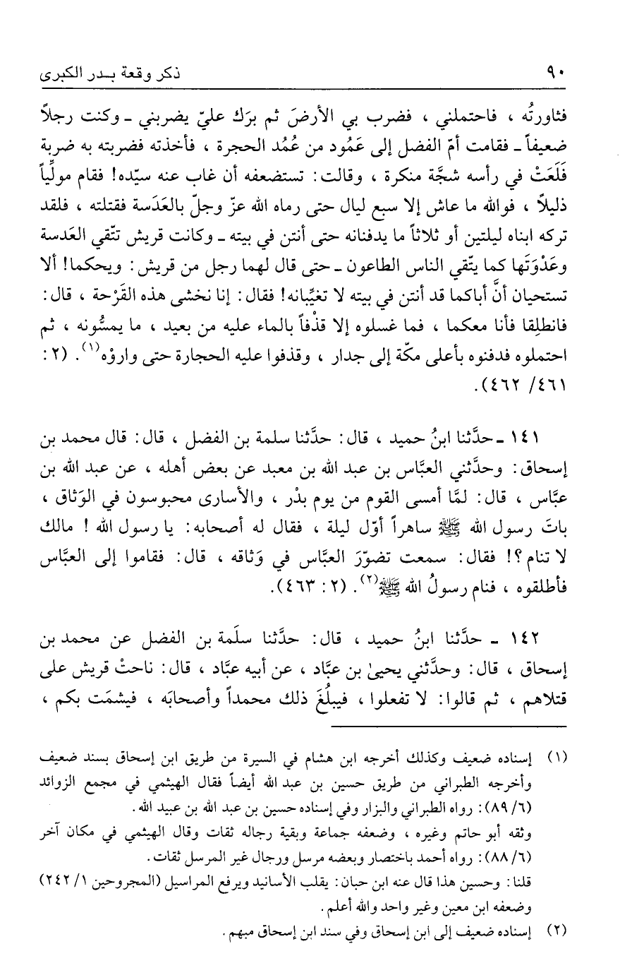 ١٤١ - حدَّثنا ابنُ حميد، قال: حدَّثنا سلمة بن الفضل، قال: قال محمد بن إسحاق: وحدَّثني العبّاس بن عبد الله بن معبد عن بعض أهله، عن عبد الله بن عبّاس، قال: لمّا أمسى القوم من يوم بدْر، والأسارى محبوسون في الوَثاق، باتَ رسول الله - صلى الله عليه وسلم - ساهرًا أوّل ليلة، فقال له أصحابه: يا رسول الله! مالك لا تنام؟ ! فقال: سمعت تضوّرَ العبَّاس في وَثاقه، قال: فقاموا إلى العبَّاس فأطلقوه، فنام رسول الله - صلى الله عليه وسلم - (٢). (٢: ٤٦٣).