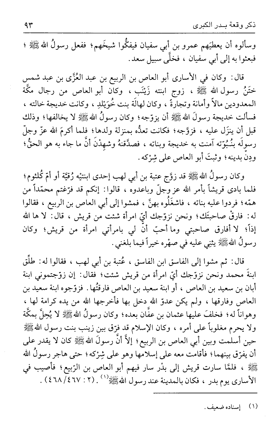 قال: وكان في الأسارى أبو العاص بن الربيع بن عبد العُزَّى بن عبد شمس ختَنُ رسول الله - صلى الله عليه وسلم -، زوج ابنته زَينَب، وكان أبو العاص من رجال مكَّة المعدودين مالًا وأمانة وتجارة، وكان لهالة بنت خُوَيلدِ، وكانت خديجة خالته، فسألت خديجة رسولَ الله - صلى الله عليه وسلم - أن يزوّجه؛ وكان رسولُ الله - صلى الله عليه وسلم - لا يخالفها؛ وذلك قبل أن ينزَل عليه، فزوَّجه؛ فكانت تعدُّه بمنزلة ولدها؛ فلما أكرمَ الله عزّ وجلّ رسولَه بنُبُوّته آمنت به خديجة وبناته، فصدَّقنهُ وشهِدْنَ أن ما جاء به هو الحقُّ؛ ودِن بدينه؛ وثبتَ أبو العاص على شِرْكه.