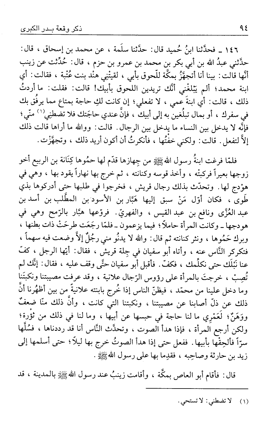 ١٤٦ - فحدَّثنا ابنُ حُميد قال: حدَّثنا سلَمة، عن محمد بن إسحاق، قال: حدَّثني عبدُ الله بن أبي بكر بن محمد بن عمرو بن حزم، قال: حُدِّثت عن زينب أنَّها قالت: بينا أنا أتجهَّزُ بمكَّة للّحوق بأبي، لقيتْنِي هنْد بنت عُتْبة، فقالت: أي ابنة محمد؛ ألم يَبْلغْني أنَّك تريدين اللحوق بأبيك! قالت: فقلت: ما أردتُ ذلك، قالت: أي ابنةَ عمي، لا تفعلي؛ إن كانت لكِ حاجة بمتاع مما يرفُق بك في سفرك، أو بمال تبلُغين به إلى أبيك، فإنَّ عندي حاجَتك فلا تضطنِي (١) منّي؛ فإنَّه لا يدخل بين النساء ما يدخل بين الرجال. قالت: ووالله ما أراها قالت ذلك إلَّا لتفعل. قالت: ولكني خفْتُها، فأنكرتُ أن أكون أريد ذلك، وتجهَّزْت.