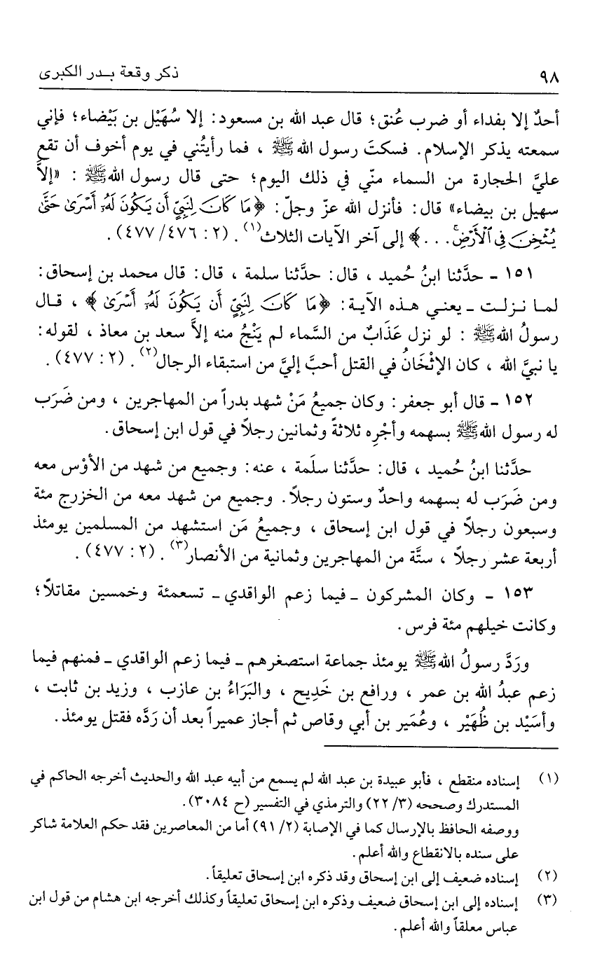 ١٥١ - حدَّثنا ابنُ حُميد، قال: حدَّثنا سلمة، قال: قال محمد بن إسحاق: لما نزلت -يعني هذه الآية: {مَا كَانَ لِنَبِيٍّ أَنْ يَكُونَ لَهُ أَسْرَى}، قال رسولُ الله - صلى الله عليه وسلم -: لو نزل عَذَابٌ من السَّماء لم يَنْجُ منه إلَّا سعد بن معاذ، لقوله: يا نبيَّ الله، كان الإثْخَانُ في القتل أحبَّ إليَّ من استبقاء الرجال (٢). (٢: ٤٧٧).