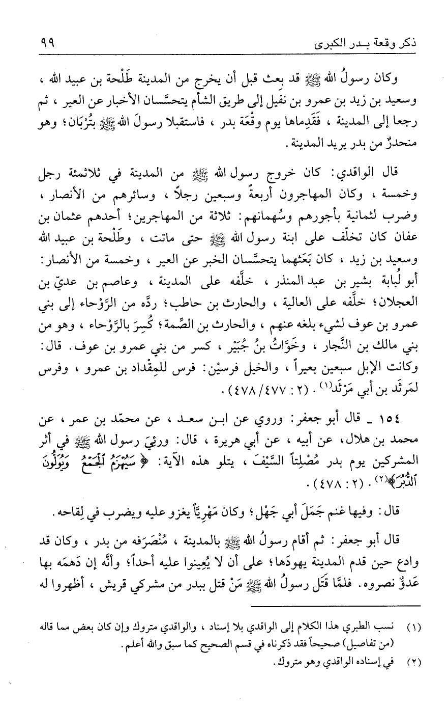 ١٥٤ - قال أبو جعفر: وروي عن ابن سعد، عن محمد بن عمر، عن محمد بن هلال، عن أبيه، عن أبي هريرة، قال: ورئيَ رسول الله - صلى الله عليه وسلم - في أثر المشركين يوم بدر مُصْلِتًا السَّيفَ، يتلو هذه الآية: {سَيُهْزَمُ الْجَمْعُ وَيُوَلُّونَ الدُّبُرَ} (٢). (٢: ٤٧٨).
