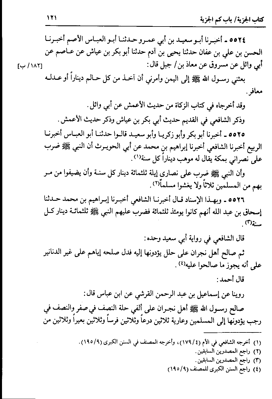5525 - أخبرنا أبو بكر وأبو زكريا وأبو سعيد قالوا حدثنا أبو العباس أخبرنا الربيع أخبرنا الشافعي أخبرنا إبراهيم بن محمد عن أبي الحويرث أن النبي صلى الله عليه وسلم ضرب على نصراني بمكة يقال له موهب ديناراً كل سنة.