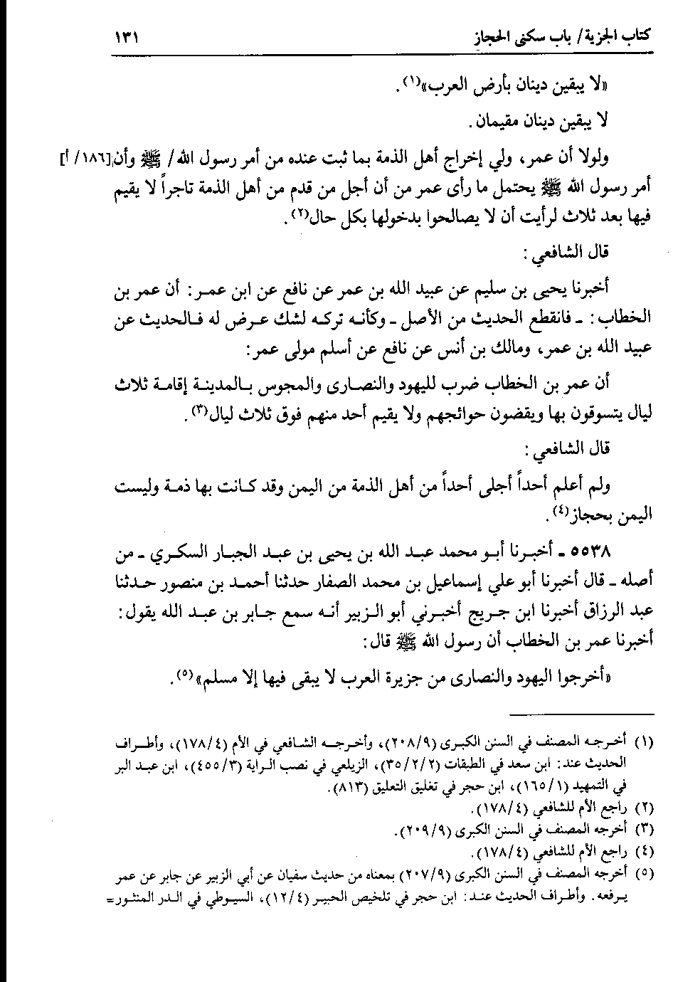 ولولا أن عمر ، ولي إخراج أهل الذمة بما ثبت عنده من أمر رسول الله 186 أ صلى الله عليه وسلم وأن أمر رسول الله صلى الله عليه وسلم يحتمل ما رأى عمر من أن أجل من قدم من أهل الذمة تاجراً لا يقيم فيها بعد ثلاث لرأيت أن لا يصالحوا بدخولها بكل حال.