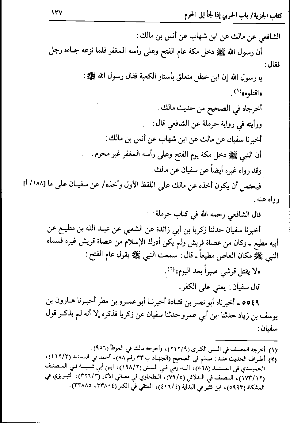 الشافعي عن مالك عن ابن شهاب عن أنس بن مالك : أن رسول الله صلى الله عليه وسلم دخل مكة عام الفتح وعلى رأسه المغفر فلما نزعه جاءه رجل فقال : يا رسول الله إن ابن خطل متعلق بأستار الكعبة فقال رسول الله صلى الله عليه وسلم : اقتلوه.