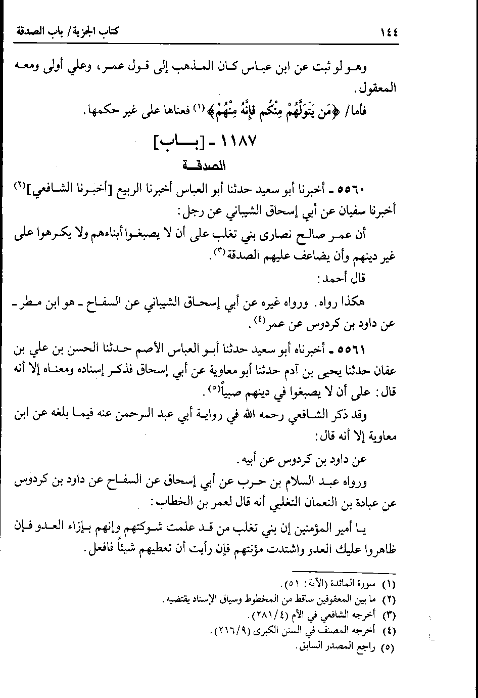 5560 - أخبرنا أبو سعيد حدثنا أبو العباس أخبرنا الربيع أخبرنا الشافعي أخبرنا سفيان عن أبي إسحاق الشيباني عن رجل : أن عمر صالح نصارى بني تغلب على أن لا يصبغوا أبناءهم ولا يكرهوا على غير دينهم وأن يضاعف عليهم الصدقة.