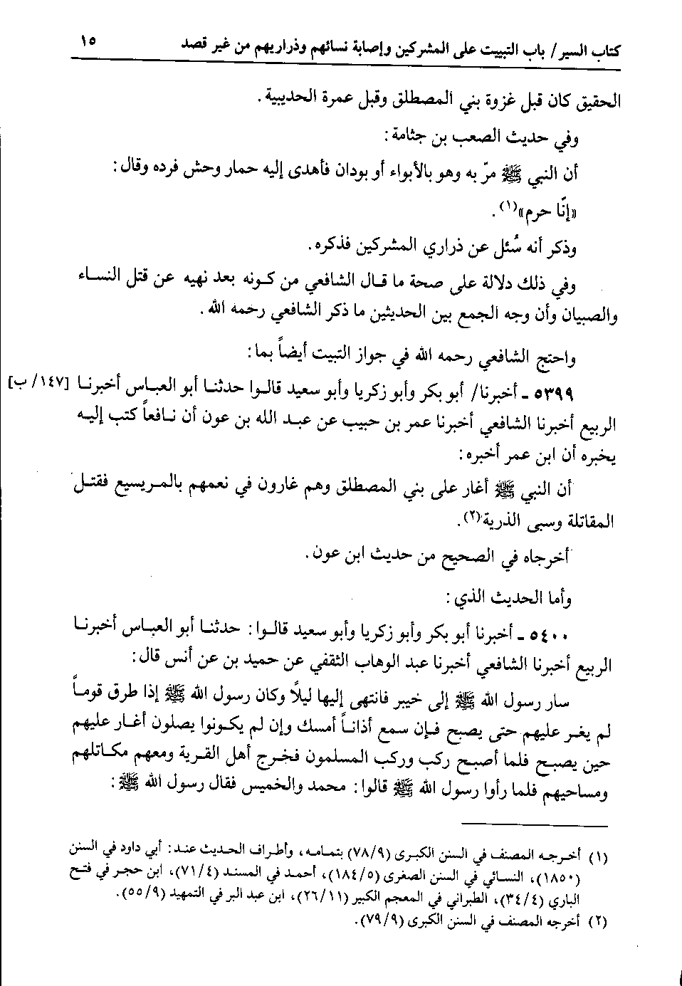 واحتج الشافعي رحمه الله في جواز التبيت أيضاً بما 5399 - أخبرنا 147 ب أبو بكر وأبو زكريا وأبو سعيد قالوا حدثنا أبو العباس أخبرنا الربيع أخبرنا الشافعي أخبرنا عمر بن حبيب عن عبد الله بن عون أن نافعاً كتب إليه يخبره أن ابن عمر أخبره : أن النبي صلى الله عليه وسلم أغار على بني المصطلق وهم غارون في نعمهم بالمريسيع فقتل المقاتلة وسبي الذرية.