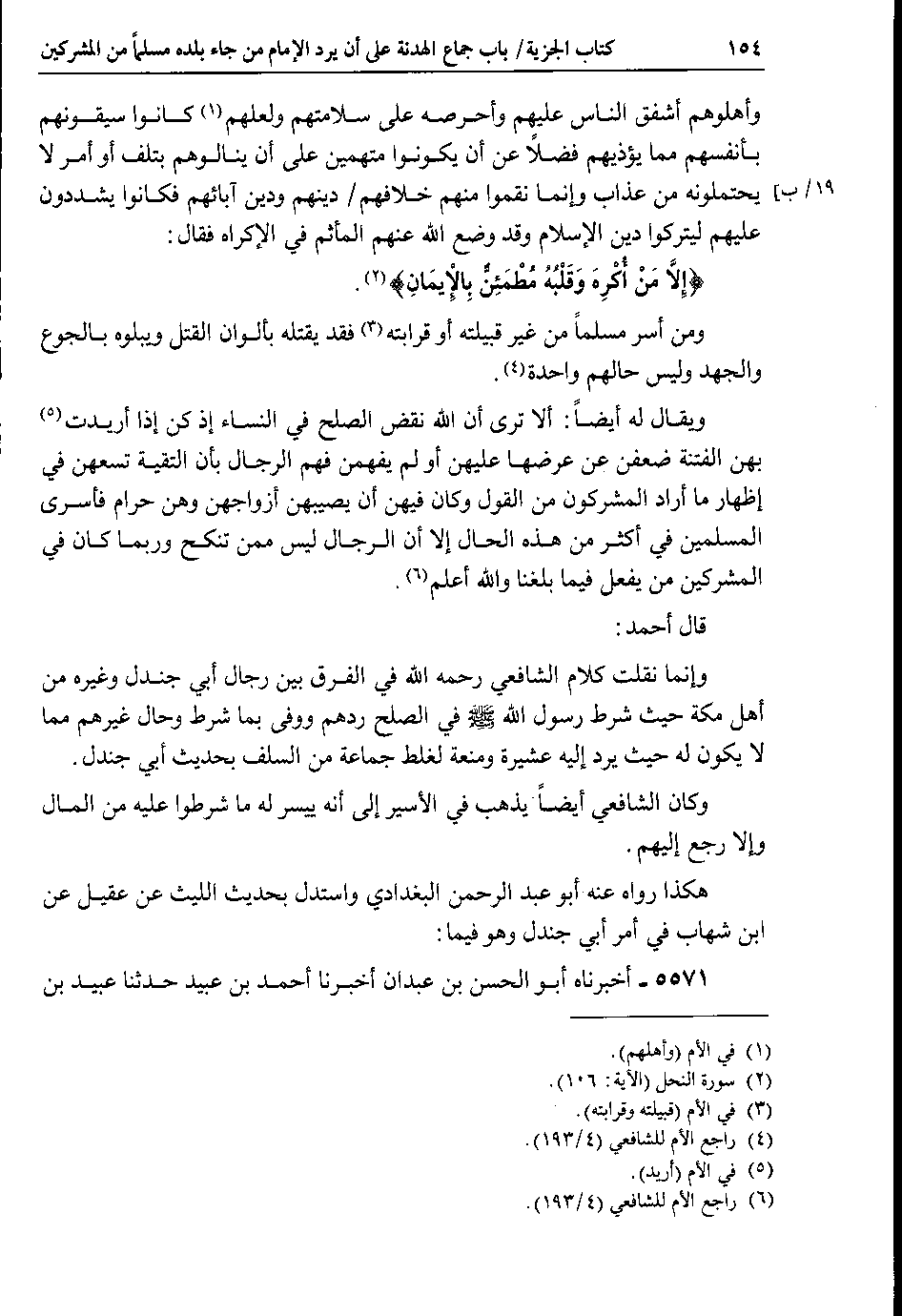 قال أحمد : وإنما نقلت كلام الشافعي رحمه الله في الفرق بين رجال أبي جندل وغيره من أهل مكة حيث شرط رسول الله صلى الله عليه وسلم في الصلح ردهم ووفى بما شرط وحال غيرهم مما لا يكون له حيث يرد إليه عشيرة ومنعة لغلط جماعة من السلف بحديث أبي جندل.