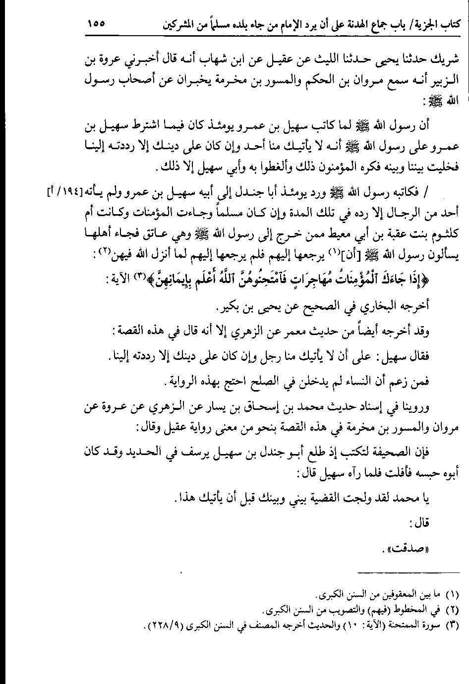 194 أ فكاتبه رسول الله صلى الله عليه وسلم ورد يومئذ أبا جندل إلى أبيه سهيل بن عمرو ولم يأته أحد من الرجال إلا رده في تلك المدة وإن كان مسلماً وجاءت المؤمنات وكانت أم كلثوم بنت عقبة بن أبي معيط ممن خرج إلى رسول الله صلى الله عليه وسلم وهي عاتق فجاء أهلها يسألون رسول الله صلى الله عليه وسلم أن يرجعها إليهم فلم يرجعها إليهم لما أنزل الله فيهن : {إِذَا جَاءَكَ الْمُؤْمِنَاتُ مُهَاجِرَاتٍ فَامْتَحِنُوهُنَّ اللَّهُ أَعْلَم بِإِيمَانِهِنَّ} الآية : أخرجه البخاري في الصحيح عن يحيى بن بكير.