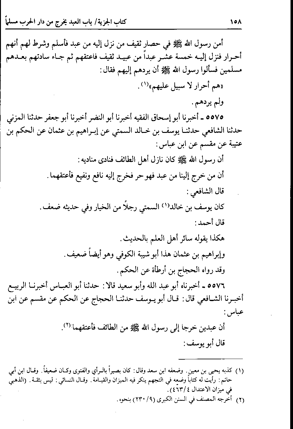 5575 - أخبرنا أبو إسحاق الفقيه أخبرنا أبو النضر أخبرنا أبو جعفر حدثنا المزني حدثنا الشافعي حدثنا يوسف بن خالد السمتي عن إبراهيم بن عثمان عن الحكم بن عتيبة عن مقسم عن ابن عباس : أن رسول الله صلى الله عليه وسلم كان نازل أهل الطائف فنادى مناديه : أن من خرج إلينا من عبد فهو حر فخرج إليه نافع ونفيع فأعتقهما.