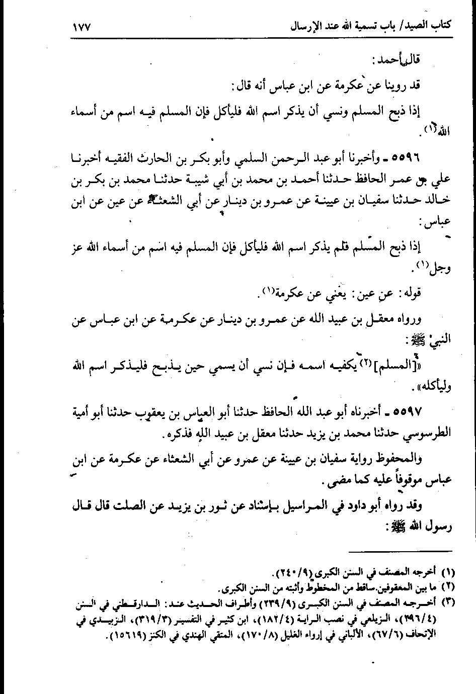 5596 - وأخبرنا أبو عبد الرحمن السلمي وأبو بكر بن الحارث الفقيه أخبرنا علي بن عمر الحافظ حدثنا أحمد بن محمد بن أبي شيبة حدثنا محمد بن بكر بن خالد حدثنا سفيان بن عيينة عن عمرو بن دينار عن أبي الشعثاء عن عين عن ابن عباس : إذا ذبح المسلم فلم يذكر اسم الله فليأكل فإن المسلم فيه اسم من أسماء الله عز وجل.