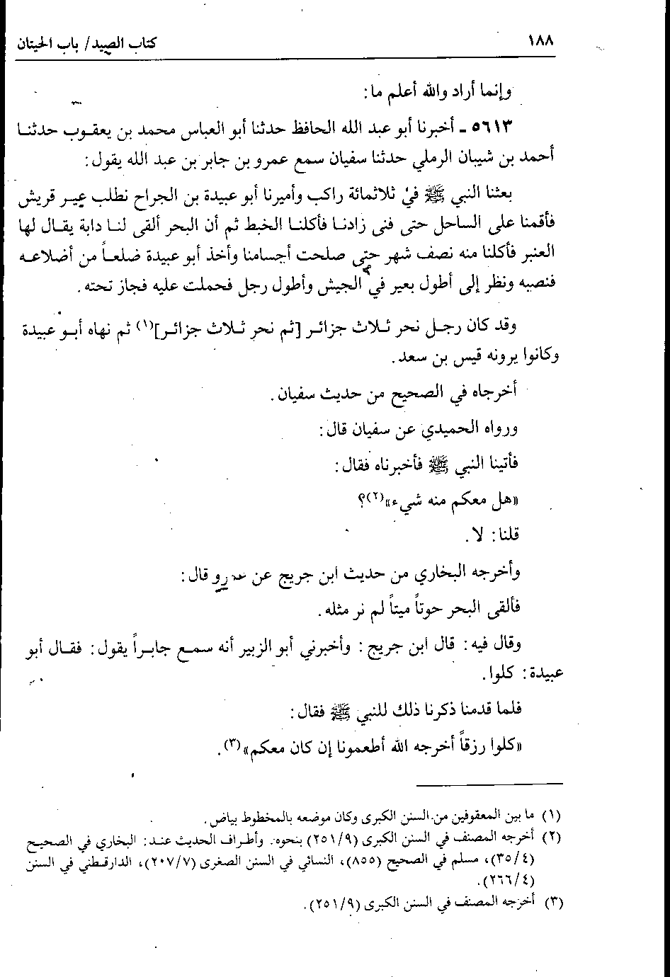 وإنما أراد والله أعلم ما 5613 - أخبرنا أبو عبد الله الحافظ حدثنا أبو العباس محمد بن يعقوب حدثنا أحمد بن شيبان الرملي حدثنا سفيان سمع عمرو بن جابر بن عبد الله يقول : بعثنا النبي صلى الله عليه وسلم في ثلاثمِئَة راكب وأميرنا أبو عبيدة بن الجراح نطلب عير قريش فأقمنا على الساحل حتى فنى زادنا فأكلنا الخبط ثم أن البحر ألقى لنا دابة يقال لها العنبر فأكلنا منه نصف شهر حتى صلحت أجسامنا وأخذ أبو عبيدة ضلعاً من أضلاعه فنصبه ونظر إلى أطول بعير في الجيش وأطول رجل فحملت عليه فجاز تحته.
