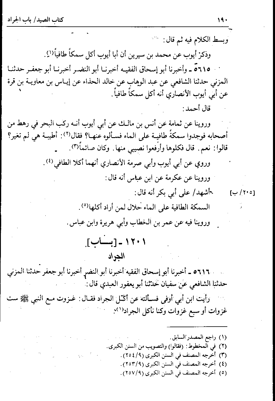 5616 - أخبرنا أبو إسحاق الفقيه أخبرنا أبو النضر أخبرنا أبو جعفر حدثنا المزني حدثنا الشافعي عن سفيان حدثنا أبو يعفور العبدي قال : رأيت ابن أبي أوفى فسألته عن أكل الجراد فقال : غزوت مع النبي صلى الله عليه وسلم ست غزوات أو سبع غزوات وكنا نأكل الجراد.