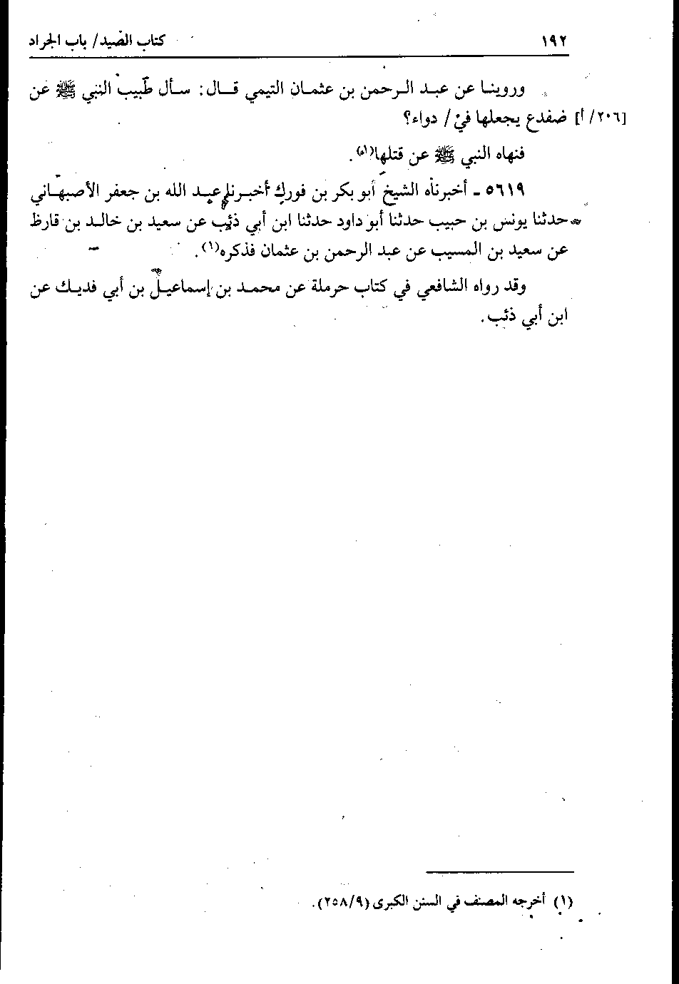 5619 - أخبرناه الشيخ أبو بكر بن فورك أخبرنا عبد الله بن جعفر الأصبهاني حدثنا يونس بن حبيب حدثنا أبو داود حدثنا ابن أبي ذئب عن سعيد بن خالد بن قارظ عن سعيد بن المسيب عن عبد الرحمن بن عثمان فذكره.