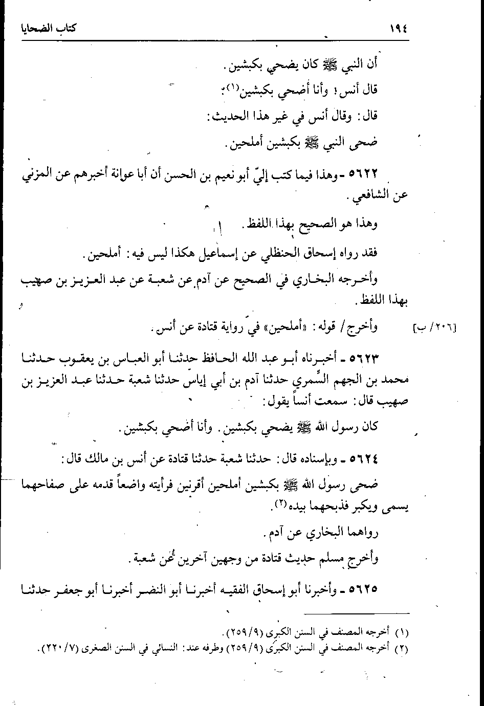 5624 - وبإسناده قال : حدثنا شعبة حدثنا قتادة عن أنس بن مالك قال : ضحى رسول الله صلى الله عليه وسلم بكبشين أملحين أقرنين فرأيته واضعاً قدمه على صفاحهما يسمى ويكبر فذبحهما بيده.