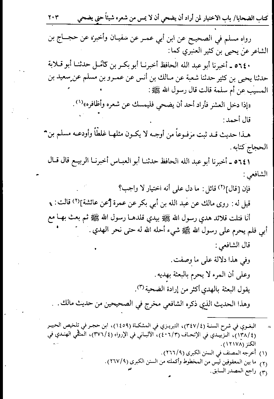 رواه مسلم في الصحيح عن ابن أبي عمر عن سفيان وأخبره عن حجاج بن الشاعر عن يحيى بن كثير العنبري كما 5640 - أخبرنا أبو عبد الله الحافظ أخبرنا أبو بكر بن كامل حدثنا أبو قلابة حدثنا يحيى بن كثير حدثنا شعبة عن مالك بن أنس عن عمرو بن مسلم عن سعيد بن المسيب عن أم سلمة قالت قال رسول الله صلى الله عليه وسلم : إذا دخل العشر فأراد أحد أن يضحي فليمسك عن شعره وأظافره.