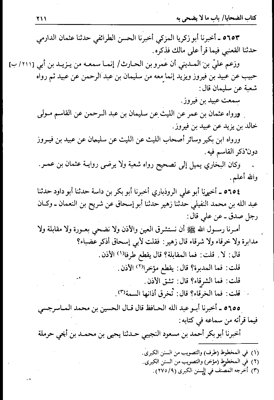 5654 - أخبرنا أبو علي الروذباري أخبرنا أبو بكر بن داسة حدثنا أبو داود حدثنا عبد الله بن محمد النفيلي حدثنا زهير حدثنا أبو إسحاق عن شريح بن النعمان - وكان رجل صدق - عن علي قال : أمرنا رسول الله صلى الله عليه وسلم أن نستشرق العين والأذن ولا نضحي بعورة ولا مقابلة ولا مدابرة ولا خرقاء ولا شرقاء قال زهير : فقلت لأبي إسحاق أذكر عضباء ؟ قال : لا . قلت : فما المقابلة ؟ قال يقطع طرفا الأذن.