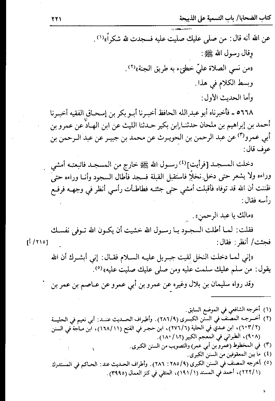 فقلت : لما أطلت السجود يا رسول الله خشيت أن يكون الله توفى نفسك فجئت 215 أ أنظر : فقال : إني لما دخلت النخل لقيت جبريل عليه السلام فقال : إني أبشرك أن الله يقول : من سلم عليك سلمت عليه ومن صلى عليك صليت عليه.