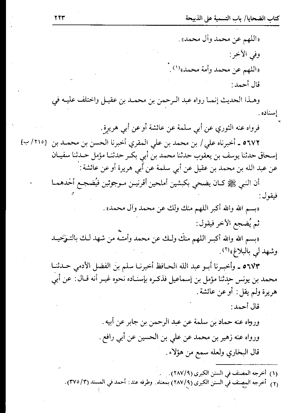 5672 - أخبرنا علي 215 ب بن محمد بن علي المقري أخبرنا الحسن بن محمد بن إسحاق حدثنا يوسف بن يعقوب حدثنا محمد بن أبي بكر حدثنا مؤمل حدثنا سفيان عن عَبد الله بن مُحَمد بن عَقِيل عن أبي سلمة عن أبي هريرة أو عن عائشة : أن النبي صلى الله عليه وسلم كان يضحي بكبشين أملحين أقرنين موجوئين فيُضجع أحدهما فيقول : بسم الله والله أكبر اللهم منك ولك عن محمد وآل محمد.