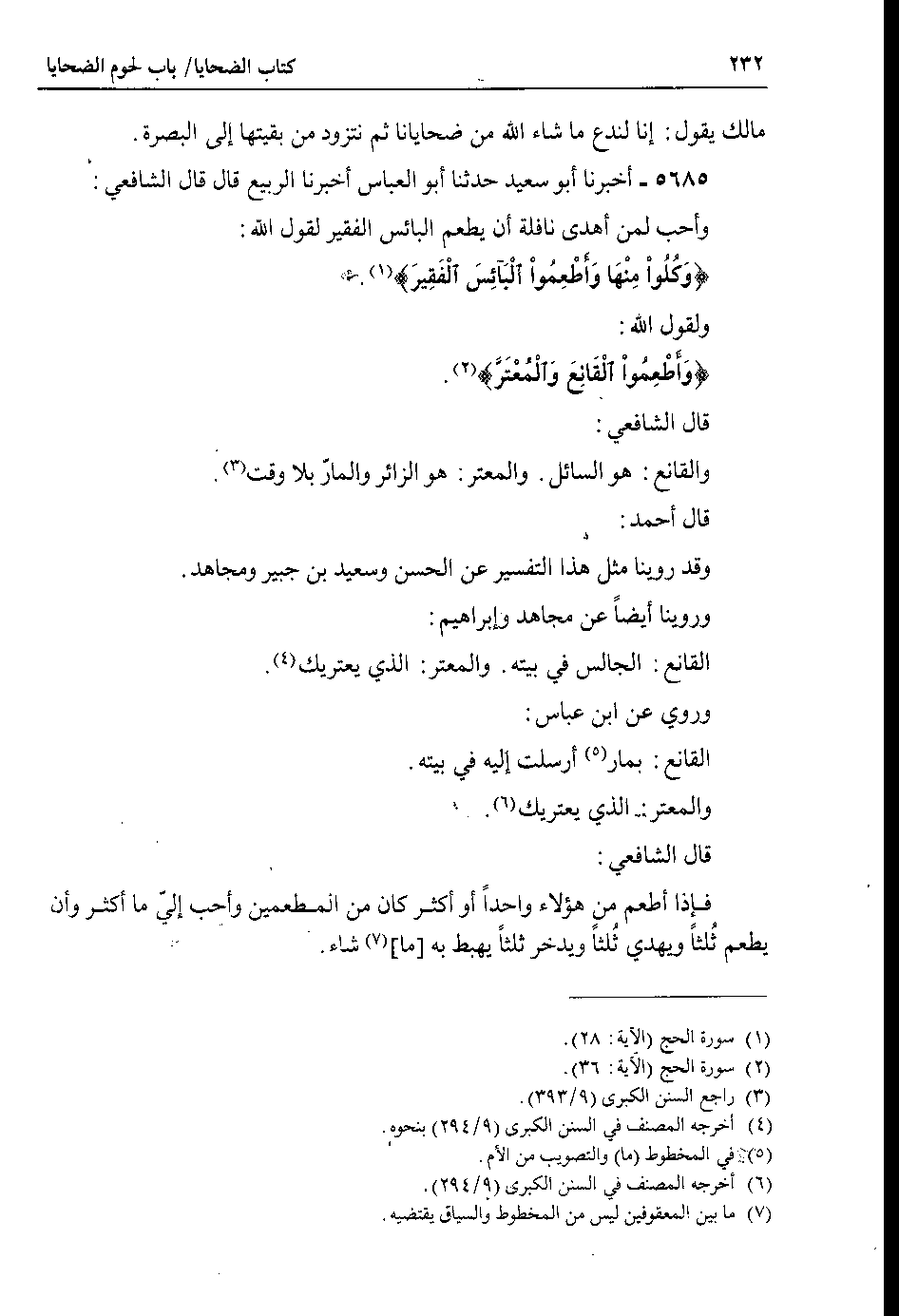 5685 - أخبرنا أبو سعيد حدثنا أبو العباس أخبرنا الربيع قال قال الشافعي : وأحب لمن أهدى نافلة أن يطعم البائس الفقير لقول الله : {وَكُلُواْ مِنْهَا وَأَطْعِمُواْ الْبَائِسَ الْفَقِيرَ}.