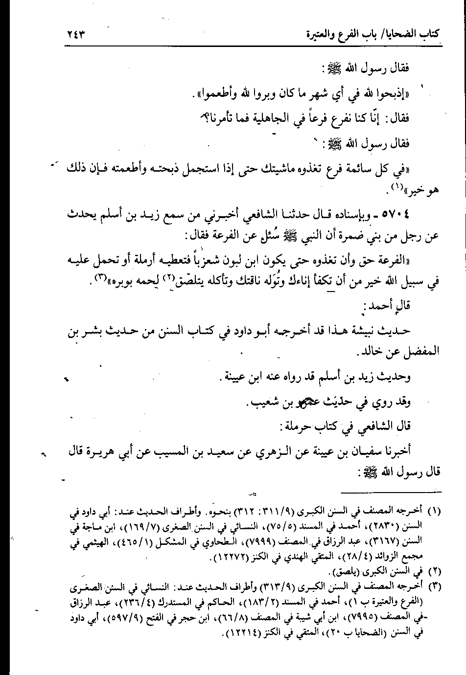 5704 - وبإسناده قال حدثنا الشافعي أخبرني من سمع زيد بن أسلم يحدث عن رجل من بني ضمرة أن النبي صلى الله عليه وسلم سُئل عن الفرعة فقال : الفرعة حق وأن تغذوه حتى يكون ابن لبون شعزباً فتعطيه أرملة أو تحمل عليه في سبيل الله خير من أن تكفأ إناءك وتُوَله ناقتك وتأكله يتلصق لحمه بوبره.