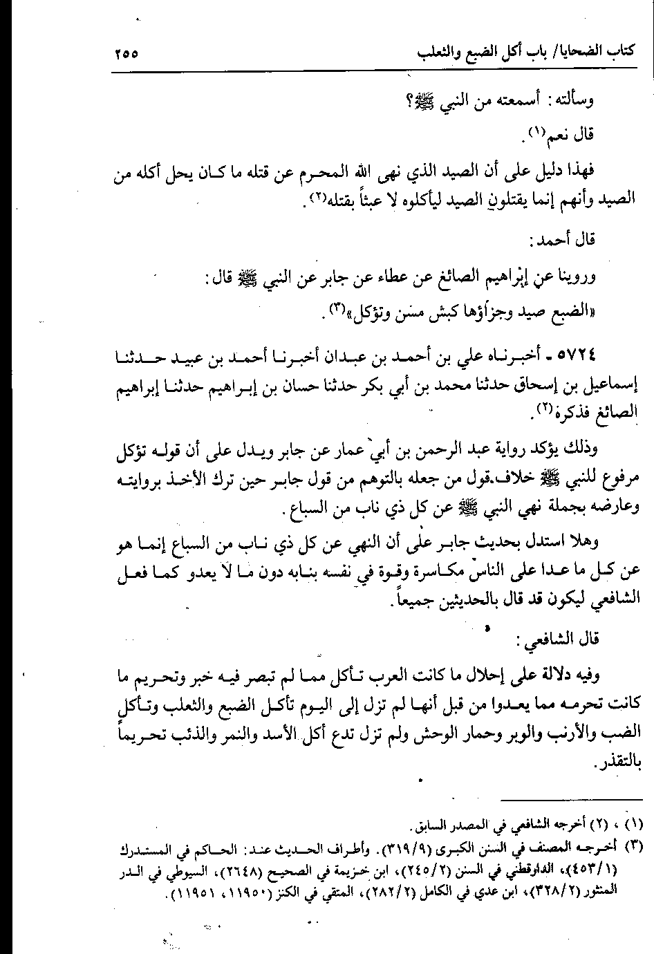 قال أحمد : وروينا عن إبراهيم الصائغ عن عطاء عن جابر عن النبي صلى الله عليه وسلم قال : الضبع صيد وجزاؤها كبش مسن وتؤكل.